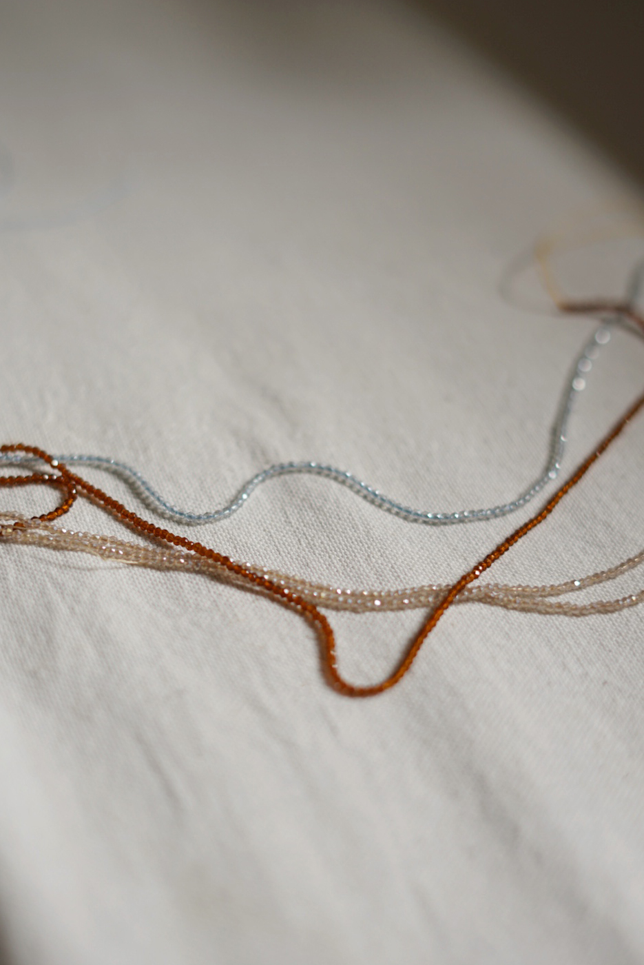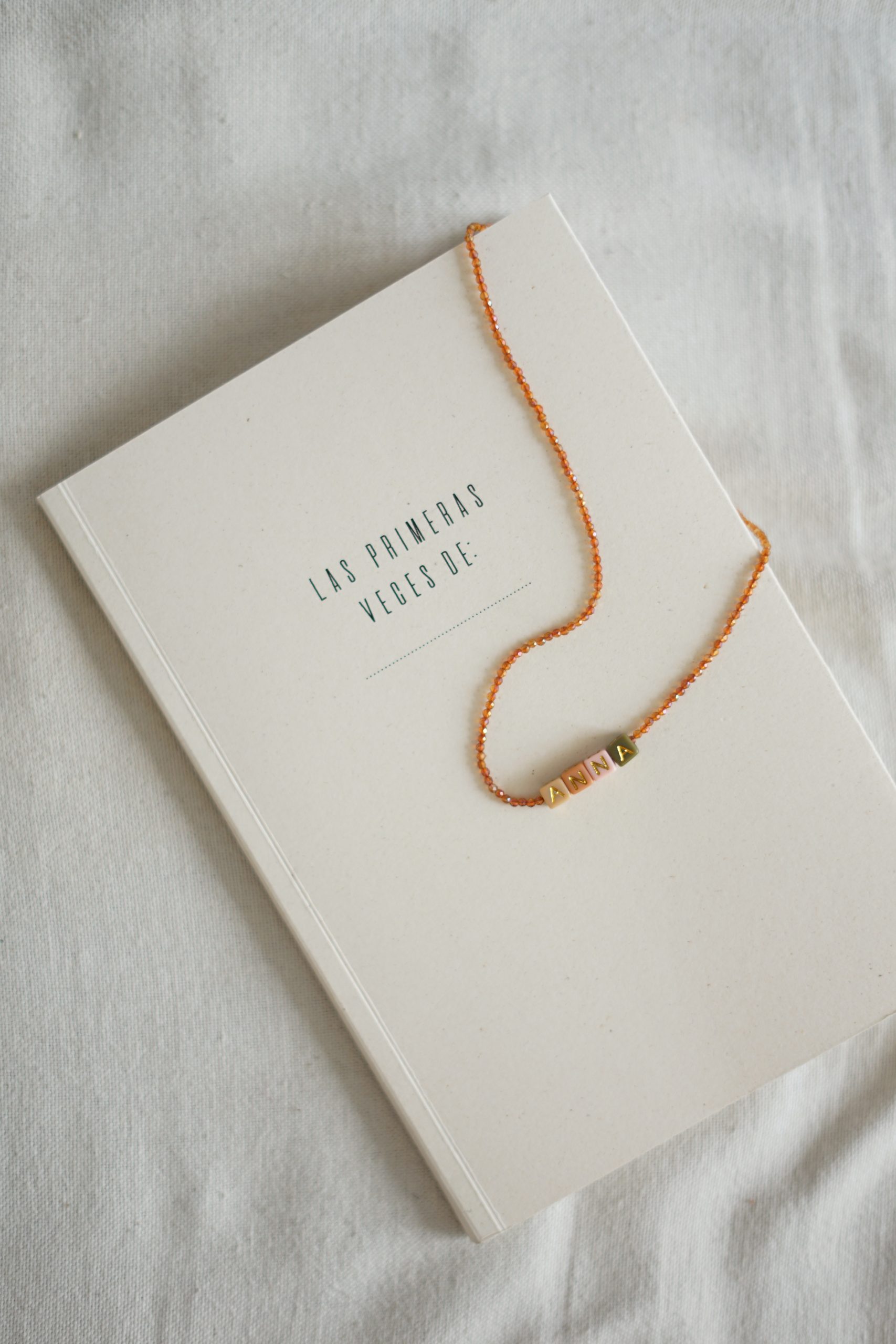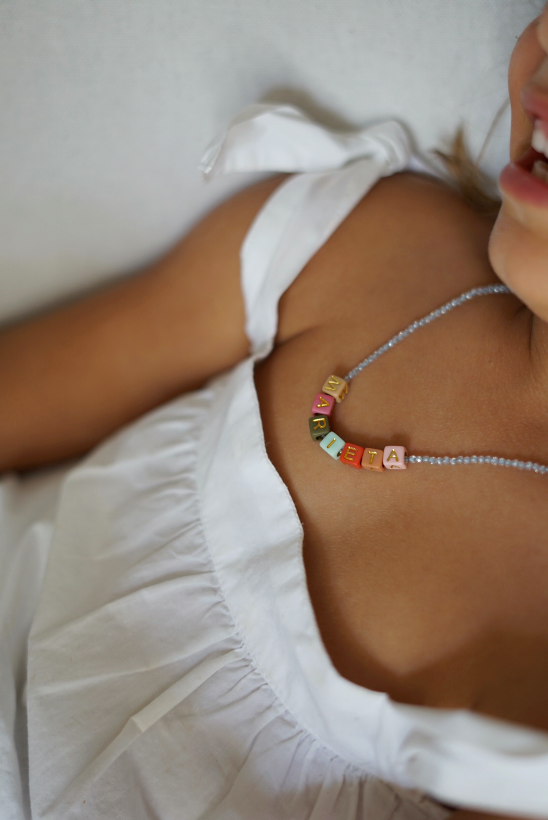 El collar está hecho a mano con cuentas de cristal facetadas, a elegir entre 3 colores diferentes. El enganche es de acero inoxidable con baño de oro. Las letras son de plástico y su color es aleatorio (buscando siempre la armonía de los colores).